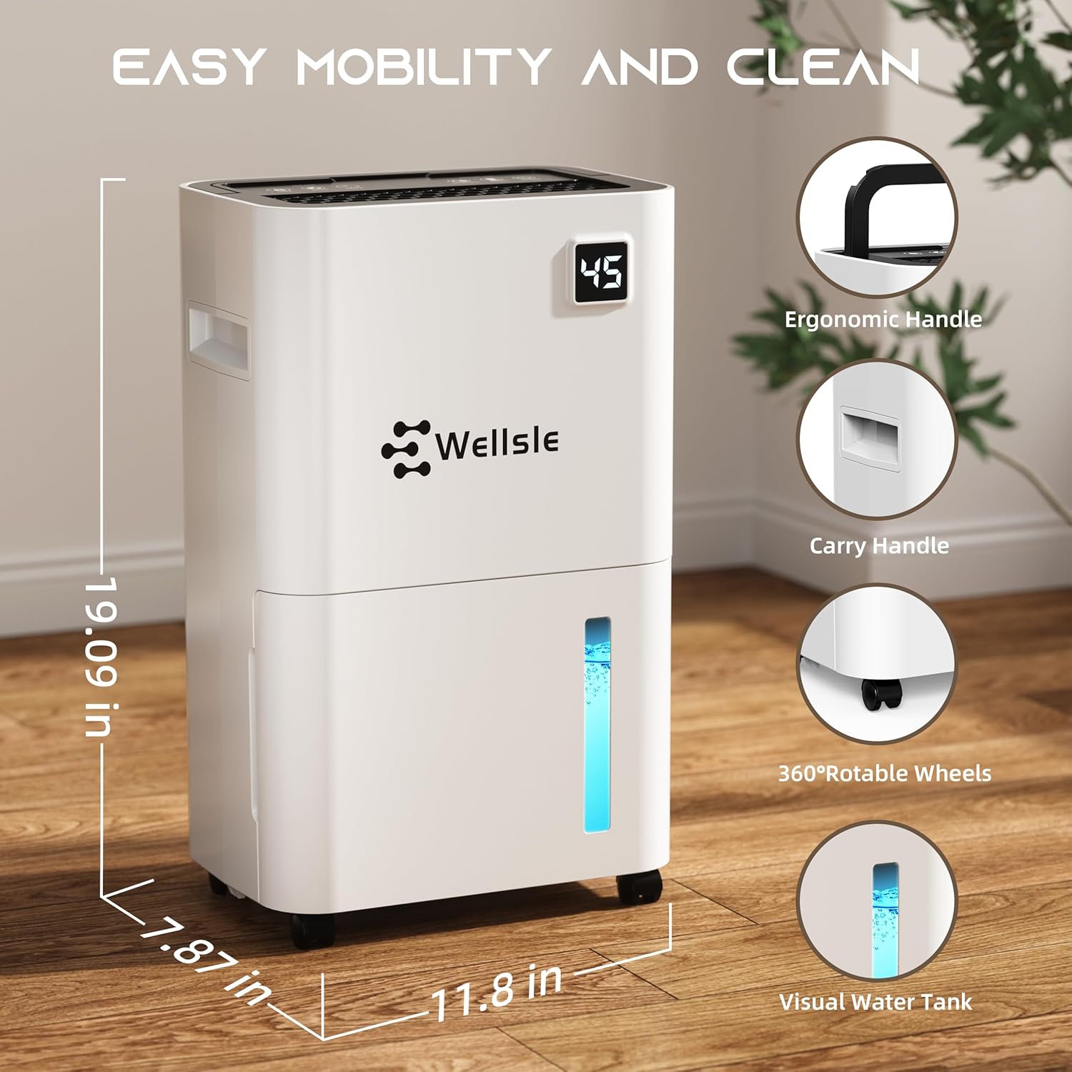 - 𝗦𝗺𝗮𝗿𝘁 𝗮𝗻𝗱 𝗖𝗼𝗻𝘃𝗲𝗻𝗶𝗲𝗻𝘁 𝗗𝗲𝘀𝗶𝗴𝗻 - Wellsle home dehumidifier comes equipped a 24HR two-way Timer and Child Lock function, convenience and safety are paramount. Equipped with a top handle, ergonomic recessed handle, and 360° invisible wheels for easy mobility. Quiet design, operating at a noise level lower than 40 decibels, ensuring it doesn't disrupt your daily life and rest!
