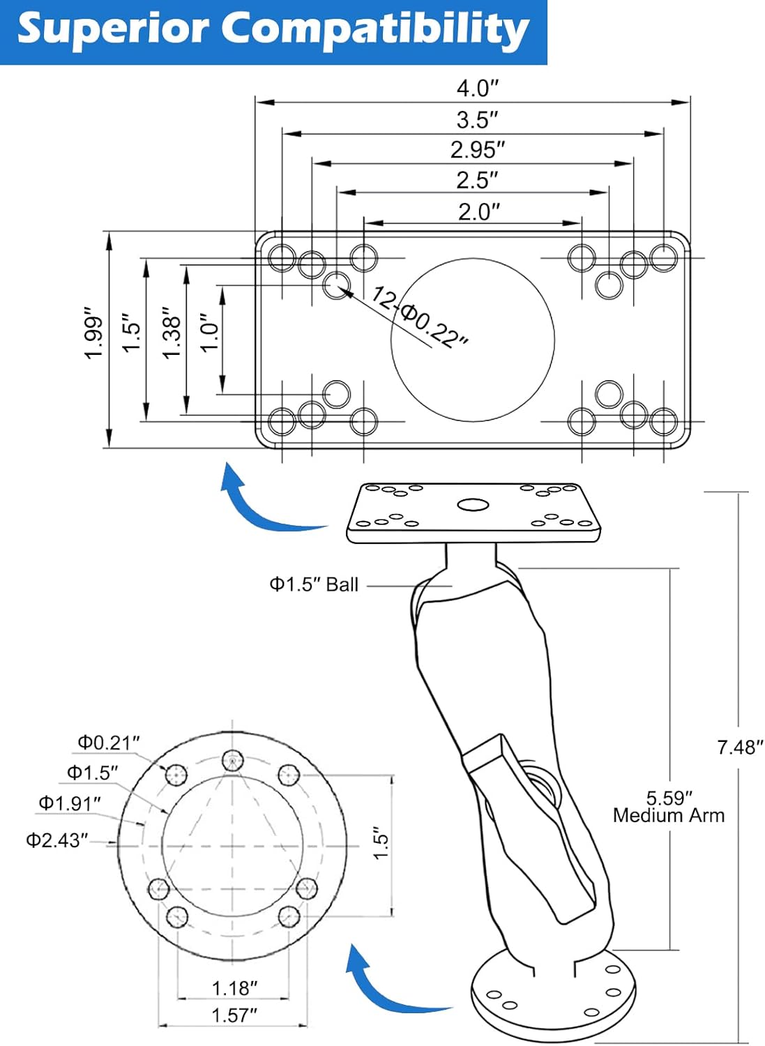 Universal Design - Includes a C size 5.5" length 1.5" double socket arm and a complete flat surface, drill-down mounting solution; The ball and socket technology allows for near-infinite adjustability. Features 1.5 inch / 38mm / C Size ball joints that are compatible with all industry standard 1.5 inch / 38 mm / C size adapters, arms