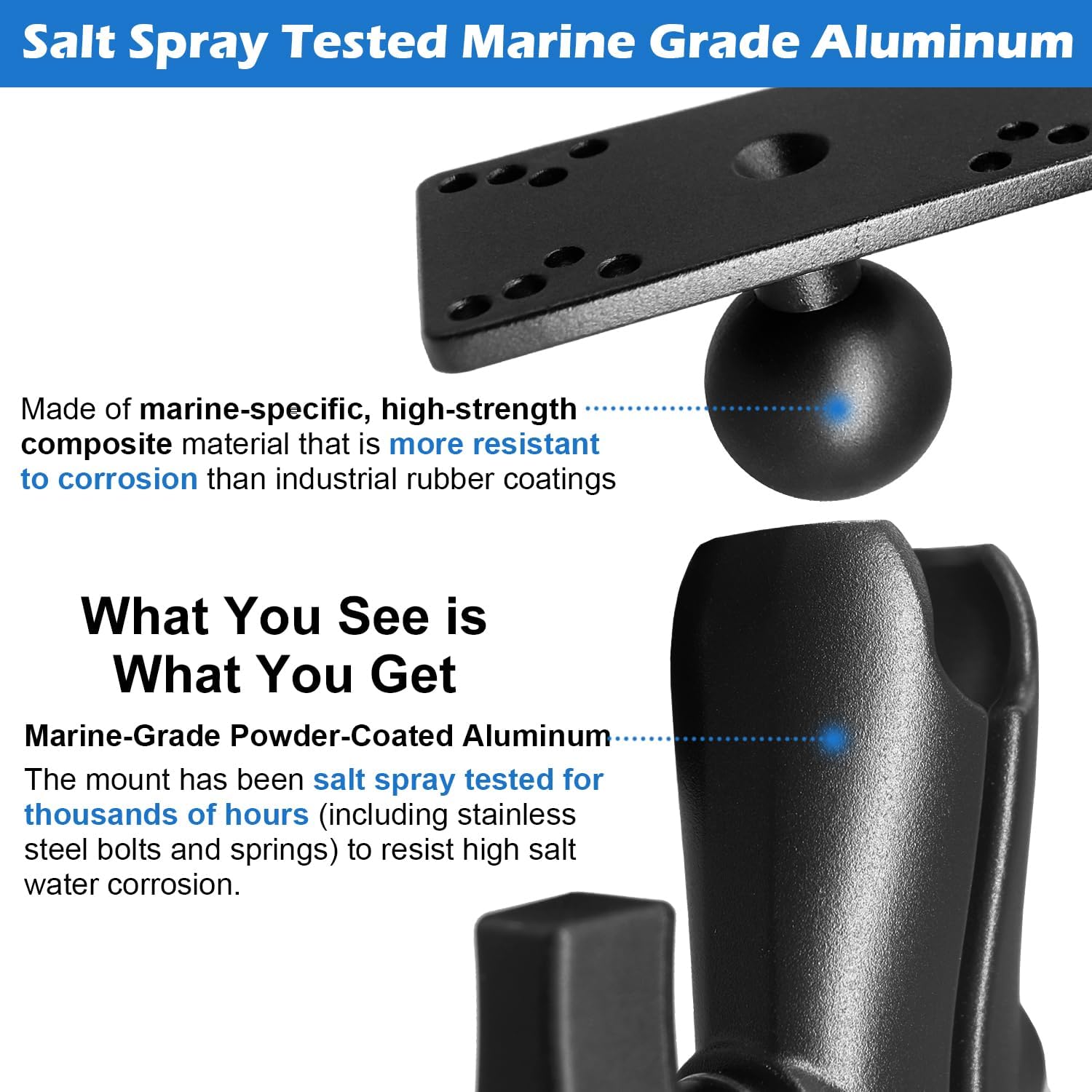 Designed for High Salt Marine Environment - Constructed of Powder-Coated Marine-Grade Aluminum and Stainless Steel Hardware. The mount has been Salt Spray Tested for thousands of hours (including stainless steel bolts and springs) to resist high salt water corrosion. Cast in one piece of aluminum for strength and durability under the impact of waves.