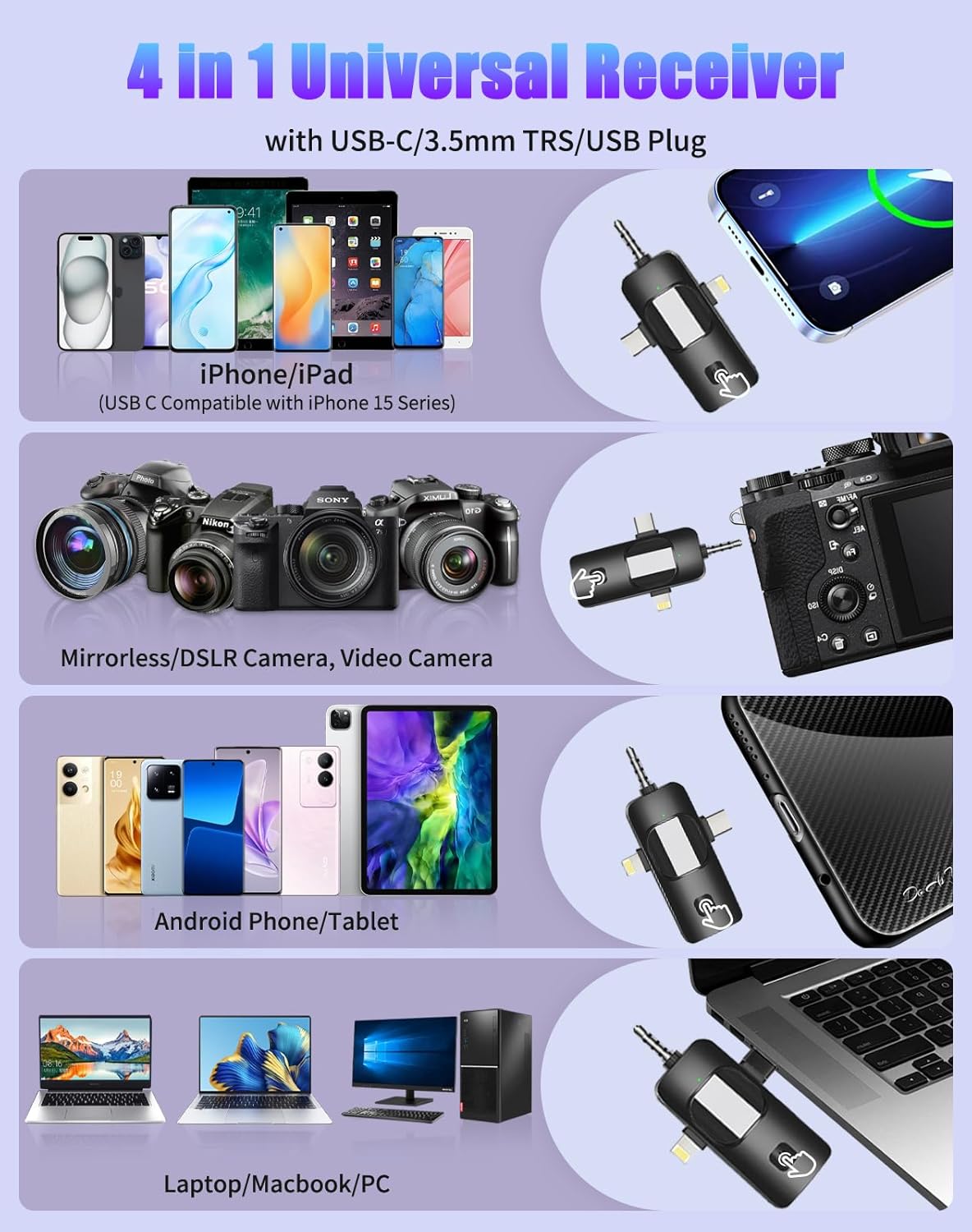 - ๐-๐ข๐ง-๐ ๐๐ง๐ข๐ฏ๐๐ซ๐ฌ๐๐ฅ ๐๐๐๐๐ข๐ฏ๐๐ซ ๐๐ง๐ ๐ ๐๐ข๐๐ซ๐จ๐ฉ๐ก๐จ๐ง๐๐ฌ: This wireless lavalier microphone set includes 1 lavalier microphones, a 4-in-1 universal receiver with USB-C/3.5mm TRS/USB-C Adapter, it is compatible with iphone(including iPhone 16) and Android phones, cameras and laptops. Perfect for filmmakers, vloggers, youtubers, mobile journalists and content creators.ย