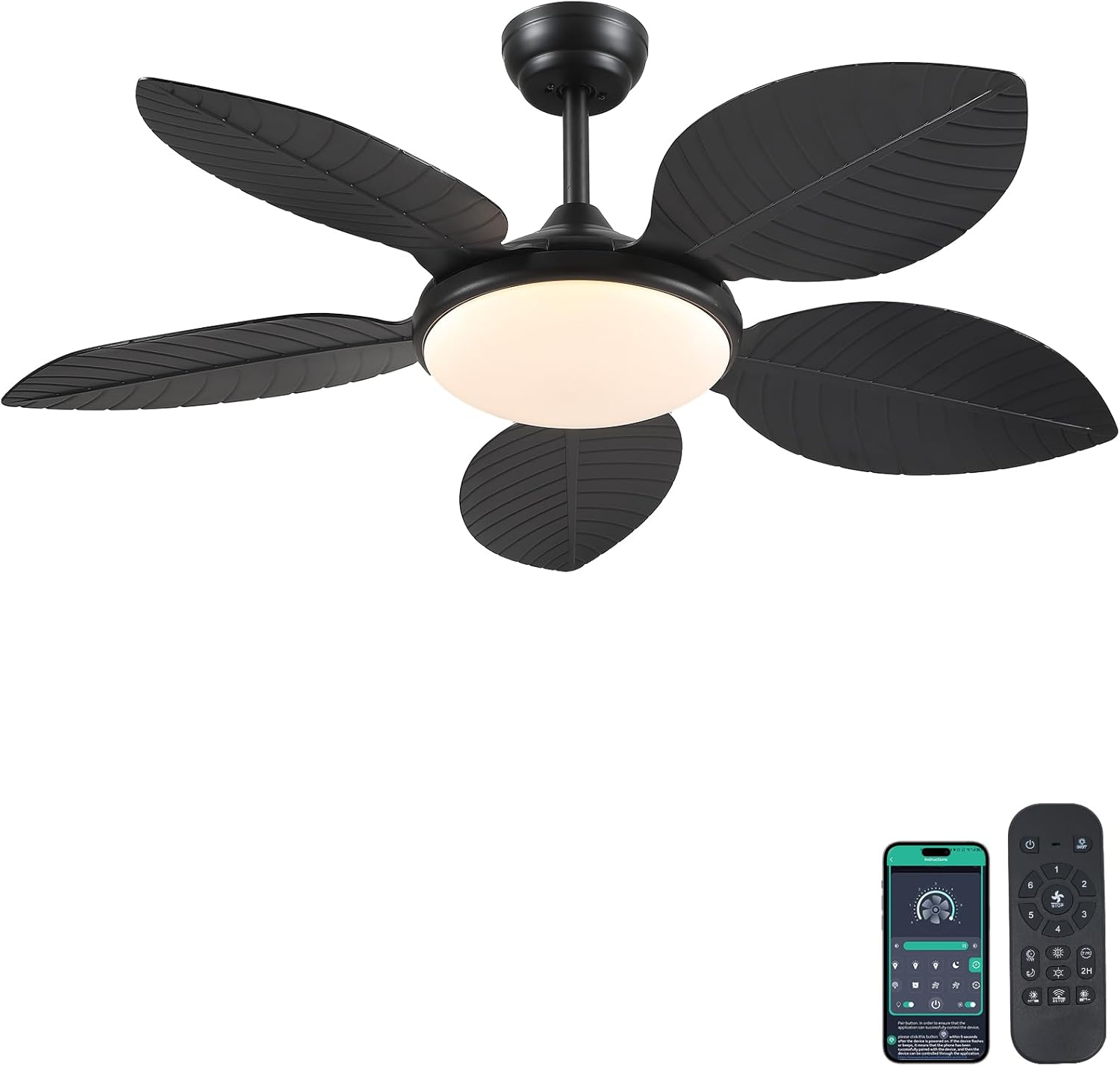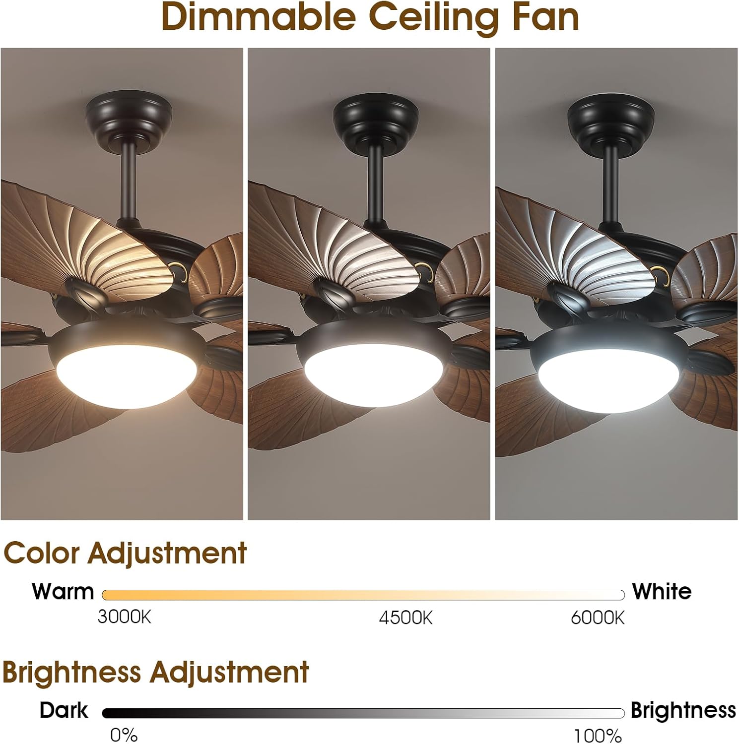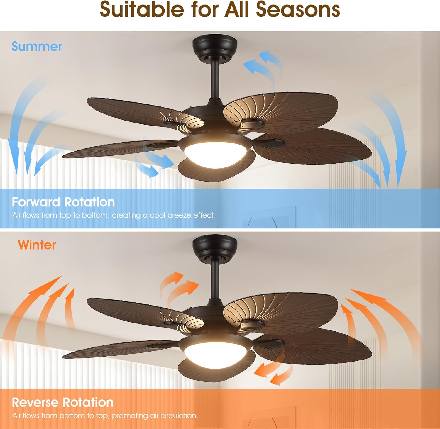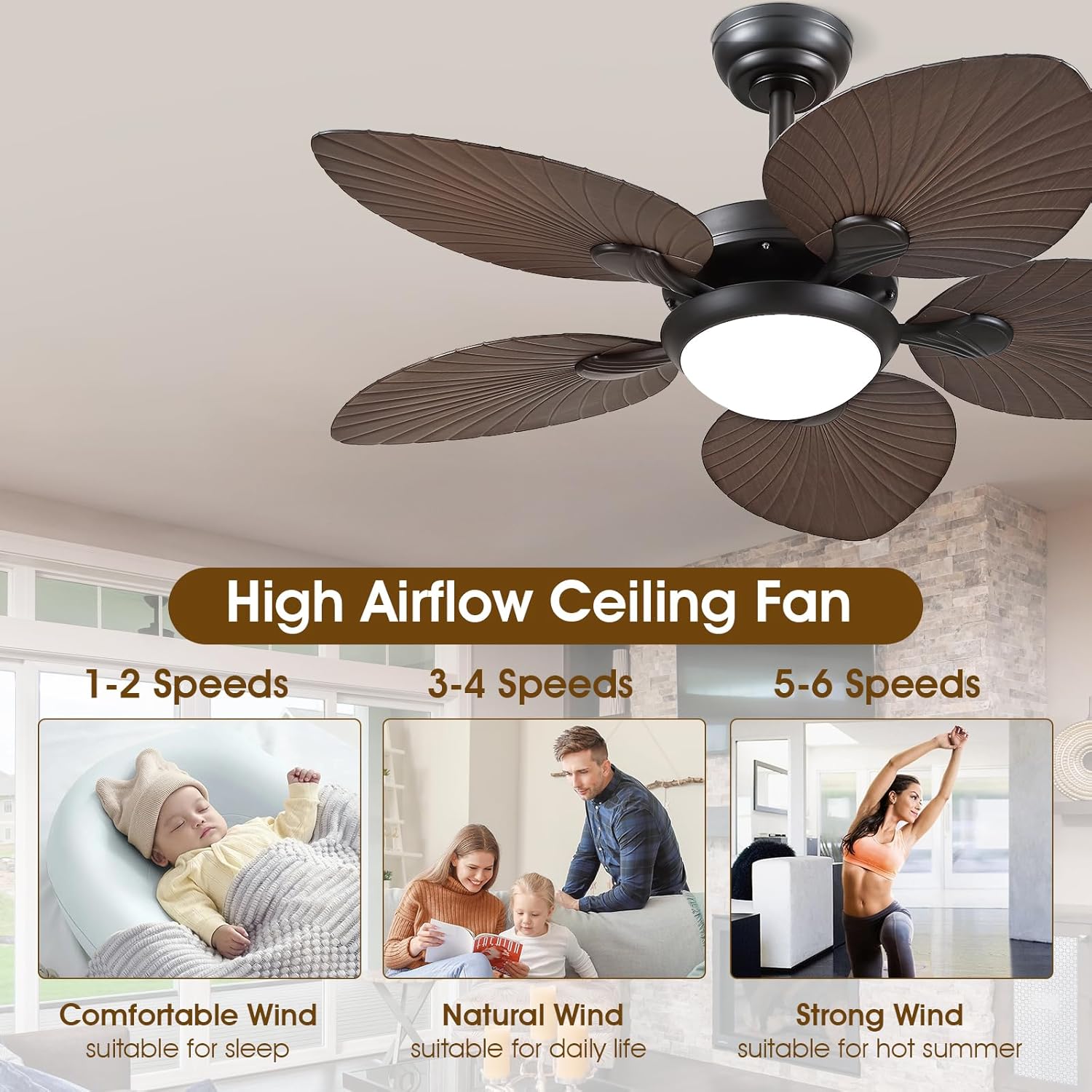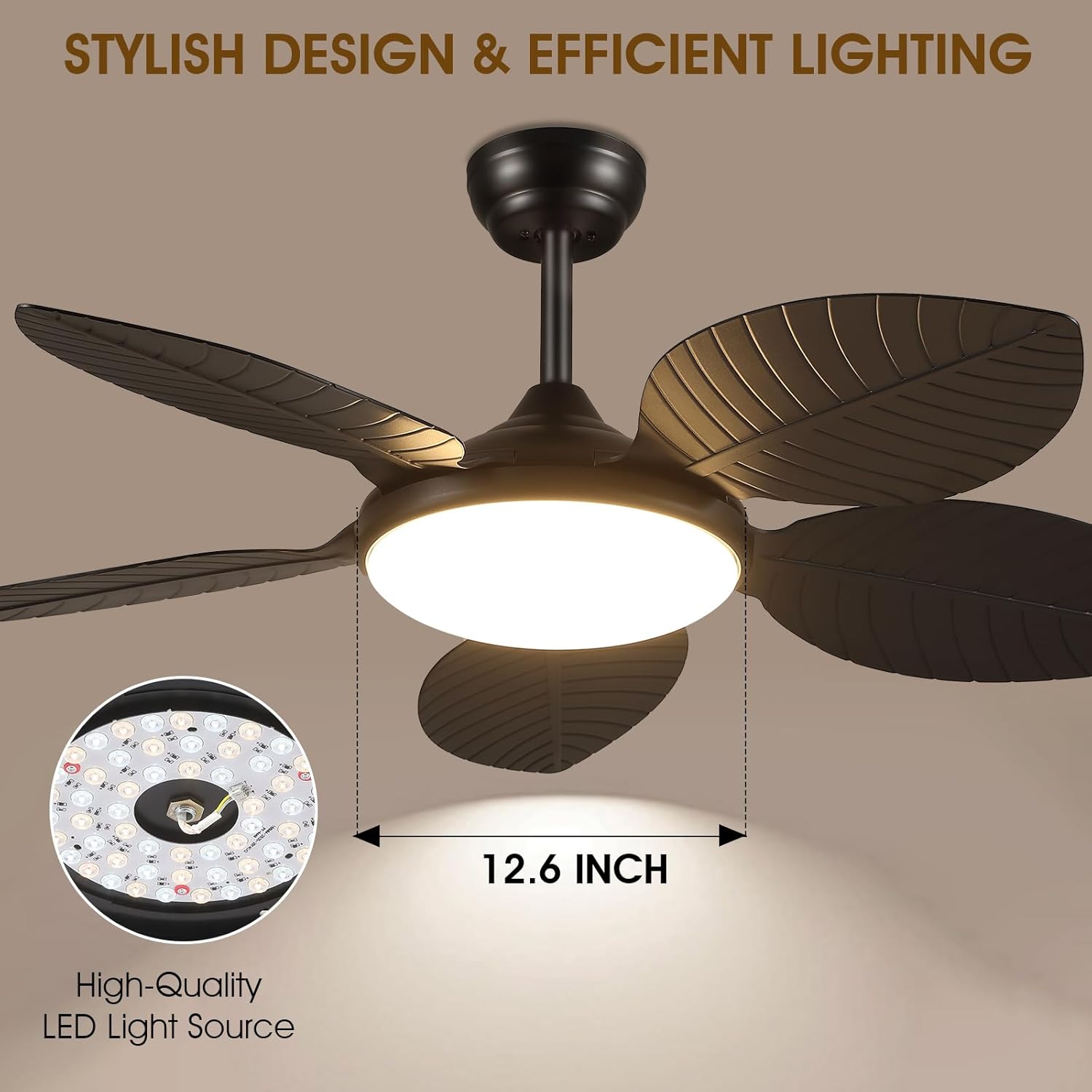 Wiviniya Ceiling Fans with Lights and Remote/APP Control, 44 Inch Tropical Palm Leaf Ceiling Fan with LED Lights, Outdoor Ceiling Fans for Patios Porch, Reversible Quiet Motor, Dimmable, Light Brown