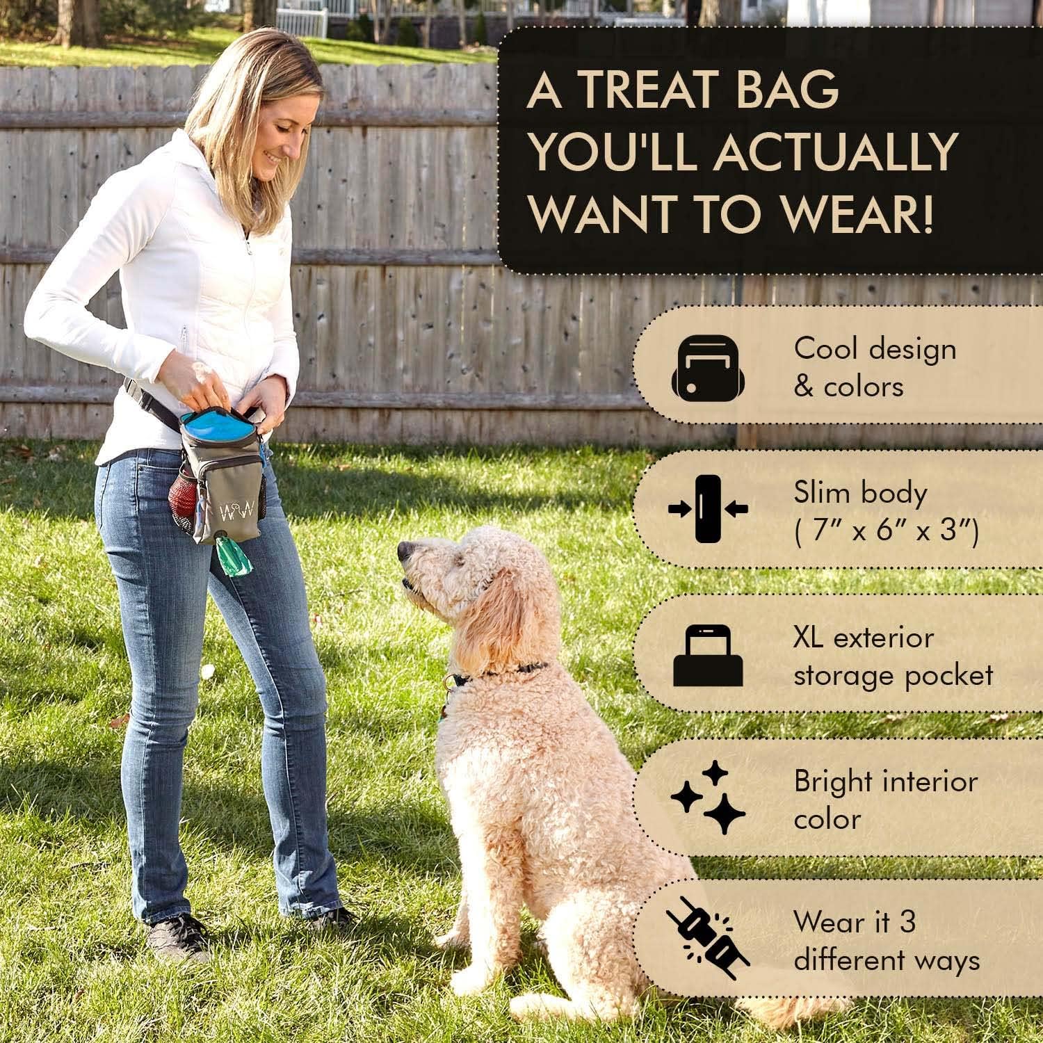 - Spacious & Organized Storage for All Essentials Designed to carry more than just treats—this XL dog treat pouch features a roomy main compartment, a secure front zipper pocket for your phone or snacks, and reinforced stretchy side pockets for water bottles, toys, or dog poop bags. Everything you need, right at your side.