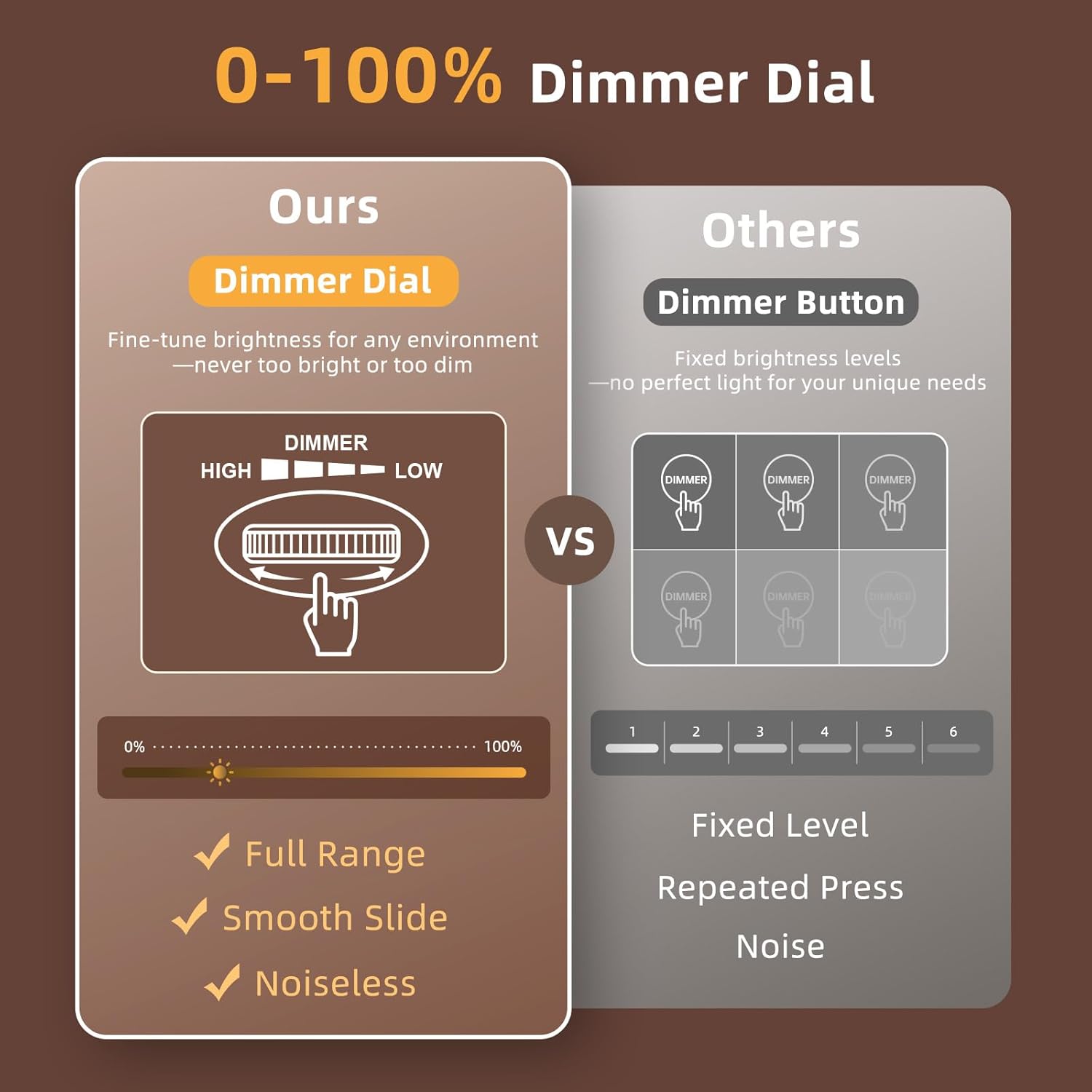 | Brightness Control | 0–100% Dimmable (Dial Adjustment) |