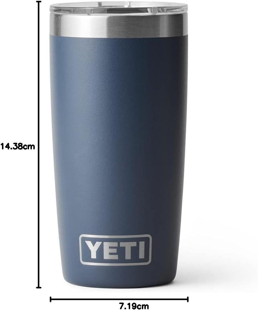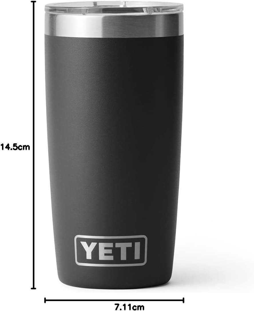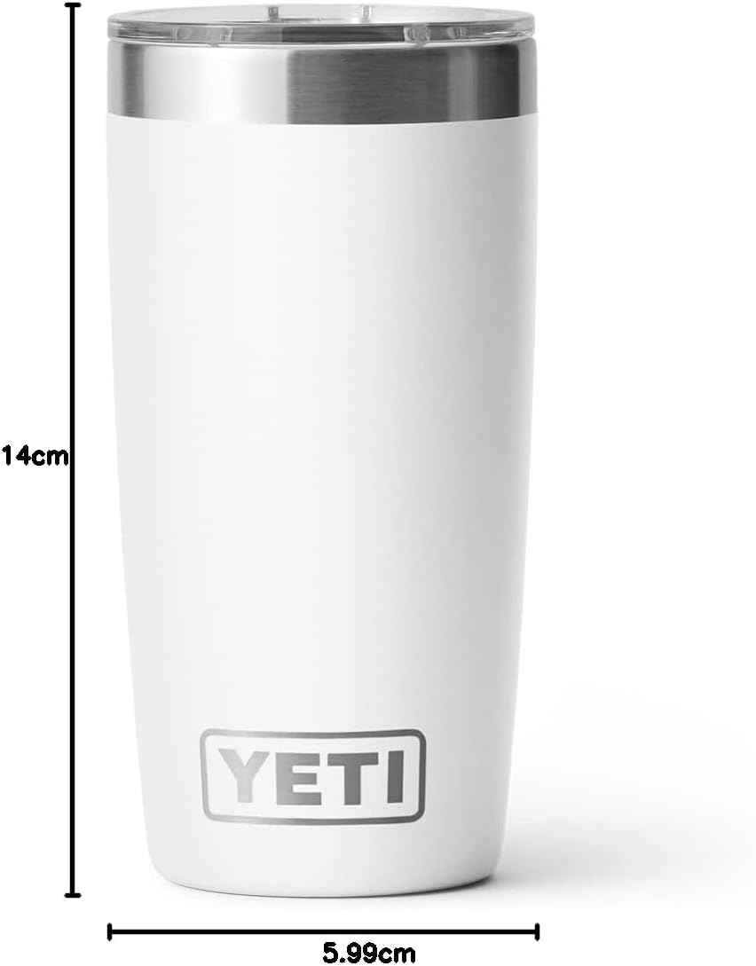 - The YETI 10 oz Rambler Tumbler stands 5.7 in high and has a lip diameter of 2.8 in. All YETI 10 oz. Tumblers are sized to fit in standard sized cup holders.