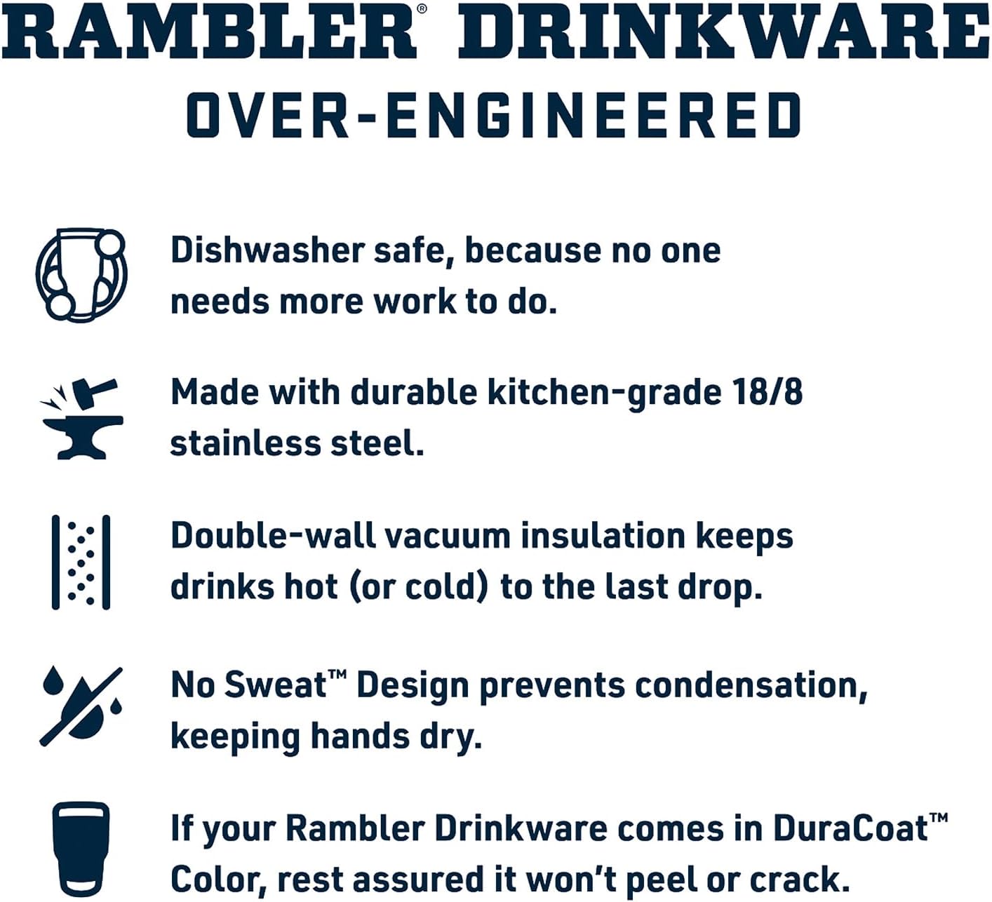 - YETI Ramblers are BPA-free, dishwasher safe, and have a No Sweat Design to make sure your hands stay dry. The tough Duracoat coating on the colored tumblers won’t crack, peel or fade