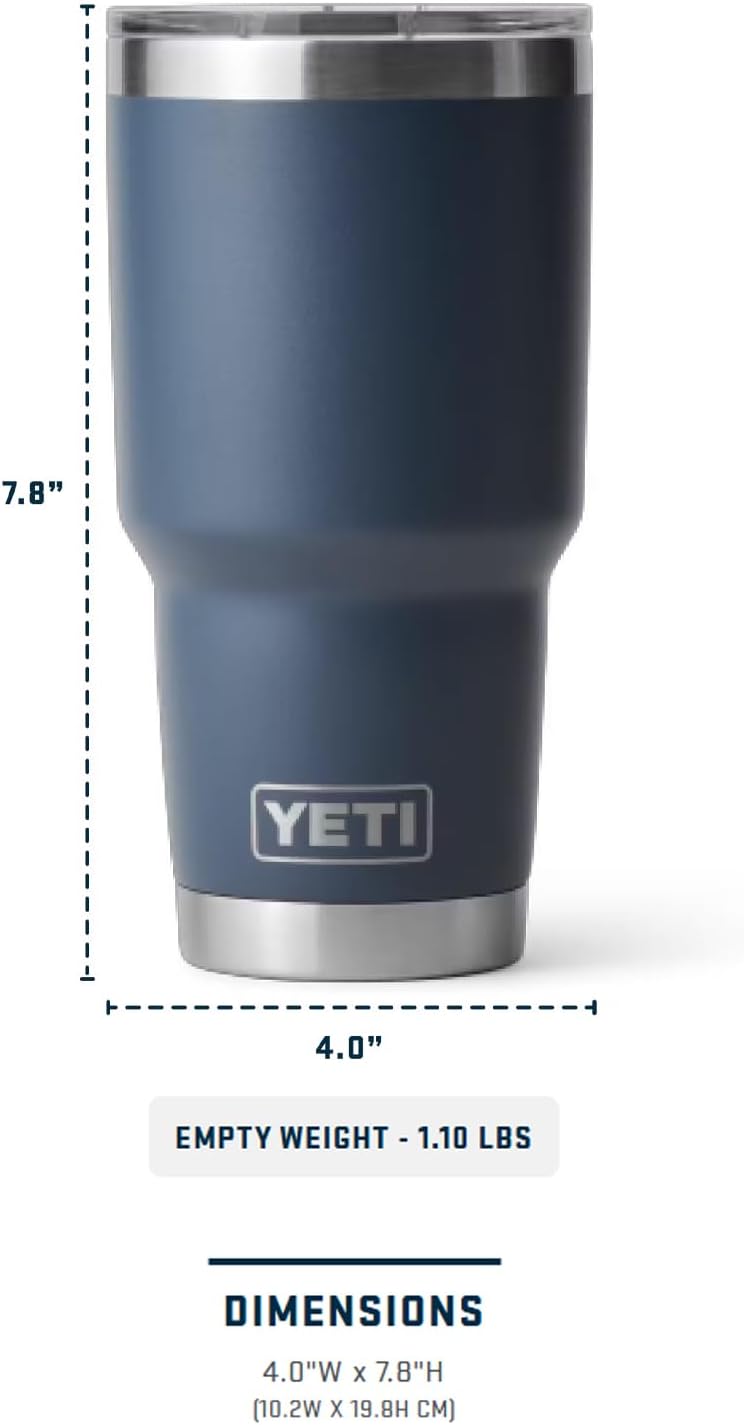 - The YETI 30 oz. Rambler Tumbler stands 7 5/8 in high and has a lip diameter of 4 in. All YETI 30 oz. Tumblers are sized to fit in standard sized cup holders.